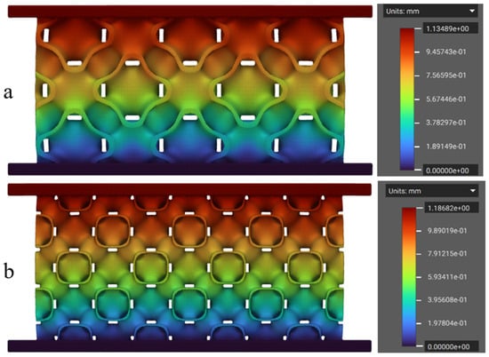 Displacement field simulated numerically for a TPMS structure made of TPC: (a) FRD333 and (b) FRD222. The pseudo-colour bars represent the displacement field.