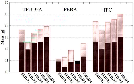 Figure 9 compares the theoretically calculated (black series) and the experimentally measured (red series) mass values for the different geometries and tested materials. For specimens printed with TPC, even though the theoretical and experimental mass values differ, these differences remain consistent across all cases, which may indicate high print quality. It is considered that the density provided by the manufacturer may be inaccurate. To achieve results that align with theoretical values, a density value of 1322 kg/m3 was found to be the most accurate. For specimens printed with TPU and PEBA, more relevant variations between theoretical and experimental mass were observed. These discrepancies may be attributed to small structural defects or accumulation of residual material, which tends to occur due to nozzle travel movements during 3D printing (Figure 5 and Figure 6). Comparing the mass of different TPMS specimen configurations, those of the same type, such as FRD222 or FRD224, exhibited approximately the same mass. Regarding the FRD22z and FRD33z architectures, the mass variations remained below 1.5 g. This shows that structure variations did not directly induce significant mass differences.