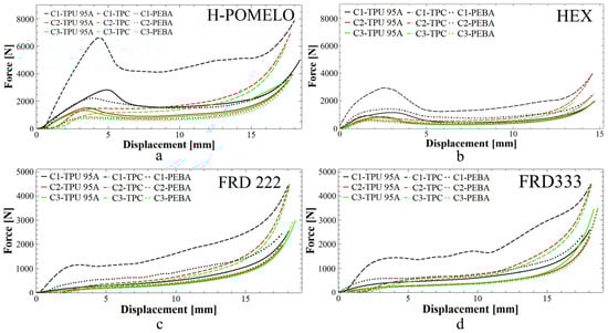 From a structural perspective, the most relevant results are those obtained with TPC (Figure 15a), as the quality of the printed samples is the best for this material. This means that the physical structure is the closest to its FEM structure. Differences in manufacturing quality are influenced by the level of structural detail. A notable example is the FRD224 structure, which, based on simulations, was expected to exhibit a higher absorption capacity than the FRD334 structure. This discrepancy is attributed to the lower printing quality of structures with a cell size of two, as these designs include finer details and bridging gaps, which are challenging to print accurately. From both a visual and an energy absorption standpoint, FRD333 and FRD334 architectures are better suited for production using FDM technology. Although FRD222 structures can also be manufactured, achieving optimal quality would require a more in-depth investigation of printing parameters and physical constraints. For instance, using a smaller nozzle size could improve accuracy.