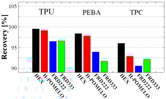Recovery percentage of pomelo peel-inspired honeycomb (H-POMELO), simple hexagonal hole honeycomb (HEX) and TPMS absorbent structures FRD222 and FRD333 for TPU, TPC and PEBA.