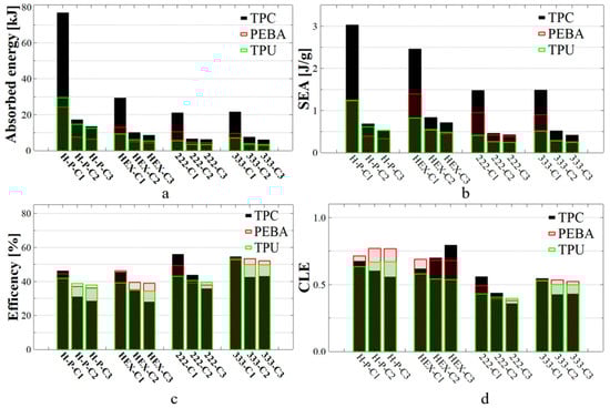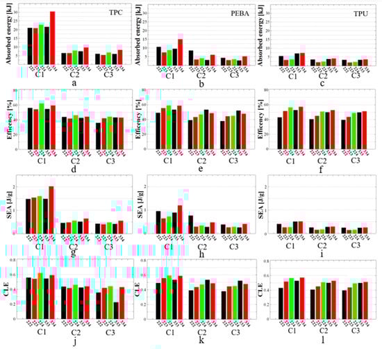 For the HEX samples, it was possible to conclude that the absorbed energy value of 29.3 kJ for the TPC structure was significantly higher than the value reported in the reference study; see Figure 12a. In that study, the average absorbed energy was 13.2 kJ, a value comparable to the energy absorption capacity of PEBA observed in the present study. Since PEBA has a lower density than TPU 95A, its SEA coefficient, as shown in Figure 12b, exhibited higher values compared to those of the reference study. For instance, in the present investigation, for HEX structures made from PEBA, the SEA coefficient reached 1.4 J/g, while in the reference study, the average value for the best material, TPU 95A, was below 1 J/g. Conversely, TPU 95A used in the current study led to SEA values lower than those reported for the same material used in the reference study. This finding further highlights the importance of selecting high-quality materials to achieve superior structural performance.