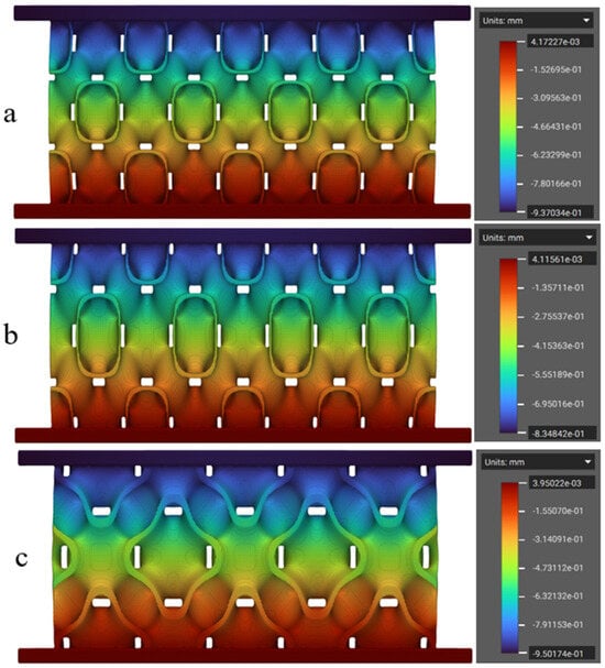 Finite element simulation of TPMS structures made of TPC: (a) FRD223, (b) FRD224, and (c) FRD334. The pseudo-colour bars represent the displacement field.