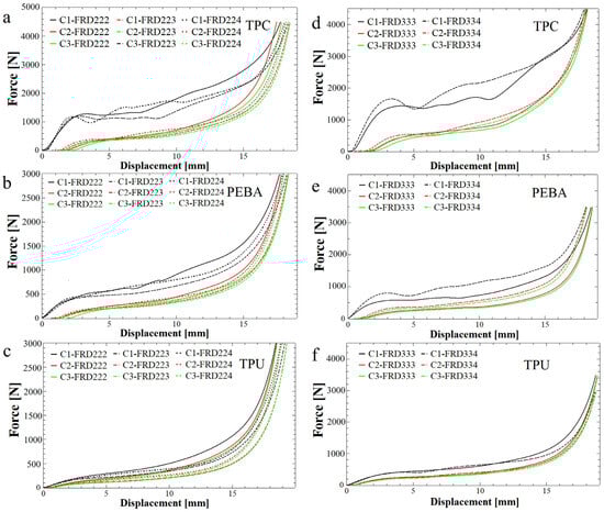 Regarding energy absorption efficiency, as shown in Figure 15d, the most efficient structure during the first compression cycle was the FRD224 structure produced from TPC (62%). However, its efficiency decreased after the second compression cycle to 46.1%. To identify the most stable structure in terms of energy absorption efficiency, Figure 15e shows that FRD333, produced from PEBA, maintains the best performance, with 56.1% after the first compression cycle and 52.1% after three consecutive compression cycles. A similar trend was also observed in the FRD334 structure produced by PEBA or TPU. In this case, the results of the second and third compression cycles were close to those observed in the initial compression cycle (Figure 15e,f). A comparable behaviour occurred in the FRD224 structure (Figure 15e,f), but the difference between the first and second compression cycles was greater than in the case of the FRD334 structure.
