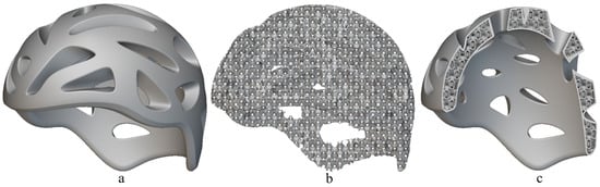 In order to clarify the practical applicability of these structures, two easily achievable applications using the 3D printing technology are presented. Specifically, Figure 16 and Figure 17 showcase a 3D model of a safety bike helmet and a 3D model along with the final product of a shoe sole, respectively. The base model of the protective helmet was sourced from the GrabCAD community library [53] and, subsequently, the internal structure was replaced with the FRD334 architecture, as shown in Figure 16b. An outer shell, presented in Figure 16a, was retained to bond the incomplete structures together. A sectional view of the final helmet finite element model is provided in Figure 16c.