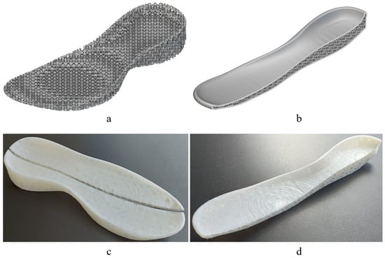 Finite element model of a shoe sole with (a) the internal FRD structure, (b) cross section of the shoes sole with outer shell, (c) 3D-printed sample of a shoe sole with internal FRD334 structure, and (d) cross section of the shoe sole with outer shell.