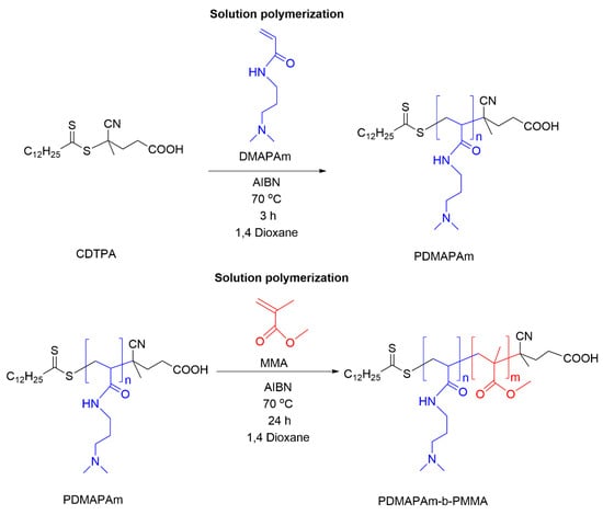 As described in previous work [19], the synthesis of PDMAPAm-b-PMMA involved two-step polymerization of the two monomers, as shown in Figure 1. First, poly(N-[3-(dimethylamino)propyl]acrylamide) (PDMAPAm) was synthesized at 70 °C by RAFT solution polymerization of N-[3-(dimethylamino)propyl]acrylamide in 1,4-dioxane. Subsequently, PDMAPAm served as a macroRAFT agent for the synthesis of a PDMAPAm-b-PMMA diblock copolymer by extending the chain via RAFT solution polymerization.