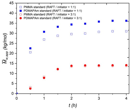 In Figure 2, the weight-average molecular weights of PDMAPAm determined using the Mark–Houwink parameters of PMMA, with those determined using the estimated Mark–Houwink parameters of PDMAPAm, are presented. It can be seen from the diagrams that the evaluations with PMMA and PDMAPAm standards generally provide similar results for molecular weights below 20 kDa. The molar masses evaluated against the estimated PMMA parameters overlap with the molar masses evaluated against the estimated PDMAPAm parameters at higher RAFT-to-initiator ratios, but a slight discrepancy is observed as the ratio decreases. This occurs because at higher molecular masses than 20 kDa, the difference between the weight-average molecular masses determined using PMMA and PDMAPAm standards increases due to the different Mark–Houwink parameters of PDMAPAm and PMMA in THF.