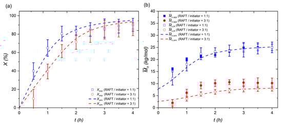 As depicted in Figure 3, the model accurately predicts the evolution of conversion and average molar mass. In particular, Figure 3a represents a complete overlap between the experimental (Xexp.) and simulated monomer conversion (Xsim.) data, whereas Figure 3b demonstrates that the experimental number-average molar mass ( data align closely with the simulated () data throughout the entire reaction time. There is a minimal deviation of the apparent number-average molecular weight not only from the simulated but also from the theoretical , which could be due to the fact that the used PMMA standard in this study is only valid at < 20 kDa, as described in the literature [57], and this PMMA standard was chosen for comparison in our study because these Mark–Houwink parameters of PMMA were also determined by viscosimetry [57]. Therefore, better overlapping of with can be seen at a higher molar mass than this, especially in the case of RAFT/initiator = 1:1. In addition to this, at the beginning of the reaction, based on the simulation result, the value in both cases increases very fast, which may be related to the fast decomposition of AIBN at 70 °C, which leads to the formation of a high amount of initiator radical at the start, as described in previous publications [11,62,63]. In addition, after 3 h of reaction time, the monomer conversion and the number-average molecular weight increase at a negligibly slow rate, which means the reaction can be terminated earlier than after 24 h [19].