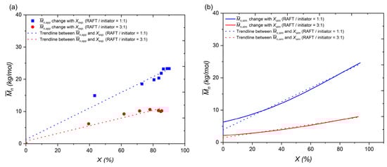 Change in number-average molar mass with monomer conversion. (a) Apparent number-average molar mass () (from GPC) change with monomer conversion (Xexp.) (from proton NMR) for both RAFT/initiator ratios of 1:1 and 3:1 and their corresponding linear trendlines. (b) Simulated number-average molar mass () change with simulated monomer conversion (Xsim.) for both RAFT/initiator ratios of 1:1 and 3:1 and their corresponding linear trendlines.