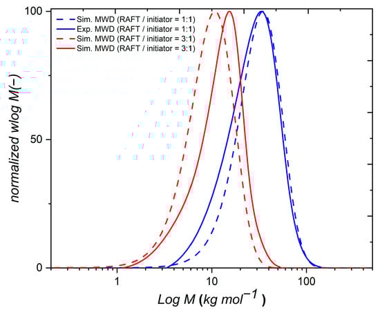 On closer inspection, there is a slight deviation in the simulated from the experimental values in the kinetic experiment with a higher RAFT agent concentration, where the maximum is close to 15 kDa, which is still outside the PMMA calibration range of GPC. The deviation is almost the same as in the comparison, which means that this could be related to the chosen PMMA standard (valid above 20 kDa) for the evaluation.