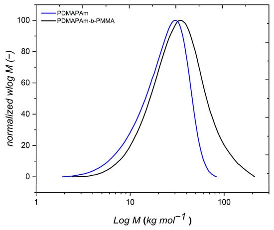 In Figure 7, the MWDs of the synthesized PDMAPAm and PDMAPAm-b-PMMA in the glass reactor are presented as measured with GPC. Comparing the MWDs of both the homopolymer and diblock copolymer, it is obvious from the graph that the MWD of PDMAPAm shifts slightly to higher molar masses as its chain is extended with the second monomer MMA. This shift clearly shows the growth of the second block [7,9,10,19].