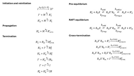 The quest to comprehend the kinetics of the polymerization process and its impact on the characteristics of the final products has been integral to the evolution of the RAFT polymerization method since its invention [36,37]. Reaction kinetic models are a vital component in this area of research, as evidenced by numerous studies in the literature. So far, several studies have been conducted regarding the kinetic modeling of bulk and solution RAFT polymerization of styrene [35,38,39,40,41,42], methyl methacrylate (MMA) [42,43,44,45], dodecyl methacrylate [46], 4-vinyl pyridine [9,10,12], NIPAM [47,48], and DMAEMA [49,50,51]. In some of them, the model has been used as a tool for upscaling the polymerization process [9,11].