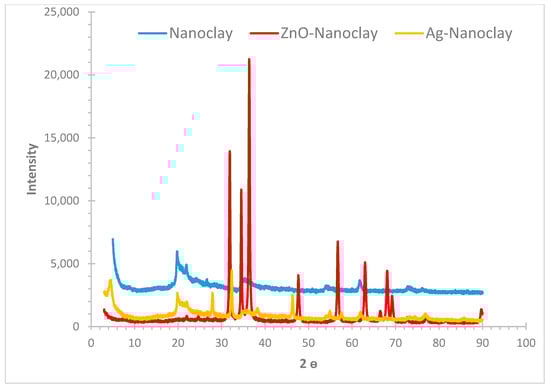 XRD patterns of nanoclay, Ag-Nanoclay, and ZnO-Nanoclay nanoparticles.