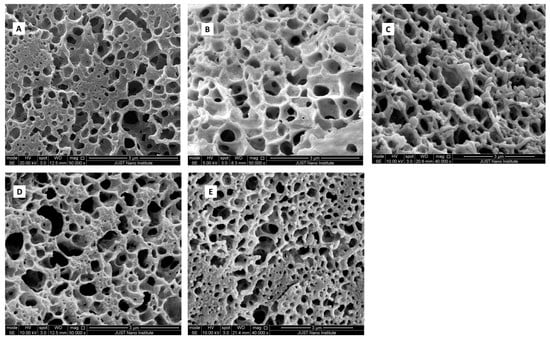 Cross-sectional SEM images of PVDF membranes: (A). Pure PVDF; (B). PVDF-1%Ag-Nanoclay; (C). PVDF-1%ZnO-Nanoclay; (D). PVDF-3%Ag-Nanoclay; (E). PVDF-3%ZnO-Nanoclay. Scale bar = 3 µm.