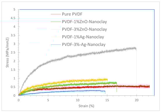 Tensile stress–strain curves of pure PVDF and PVDF nanocomposite membranes—the influence of nanoclay composite type and loading on maximum strength and elongation at break.