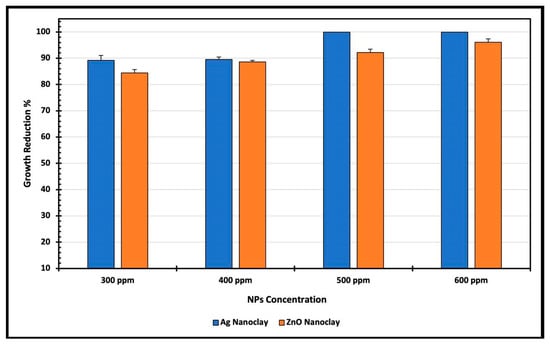 AgNPs attached to the nanoclay exhibited a spherical shape and a high surface area-to-volume ratio, which improves their capacity to bond with the cell walls of the bacteria, enhancing their antibacterial effectiveness [55]. AgNPs can modify the phosphor-tyrosine profiles of bacterial peptides, affecting the signal-transduction pathways that restrict microbial growth and proliferation. Their antibacterial activity is dose dependent and independent of the bacteria’s antibiotic resistance mechanisms. When E. coli cells are treated with AgNPs, the nanoparticles aggregate in the bacterial membranes, increasing membrane permeability and ultimately leading to cell death [56,57,58].