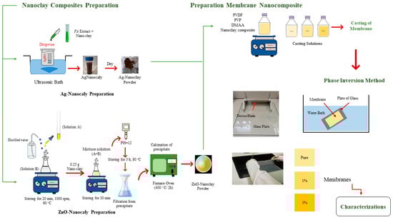 Methodology for preparation of Ag-Nanoclay composite (previously prepared in [23]), ZnO-Nanoclay composite, and PVDF nanocomposite membranes with different nanoclay composite loadings (0 wt%, 1 wt%, 3 wt%).