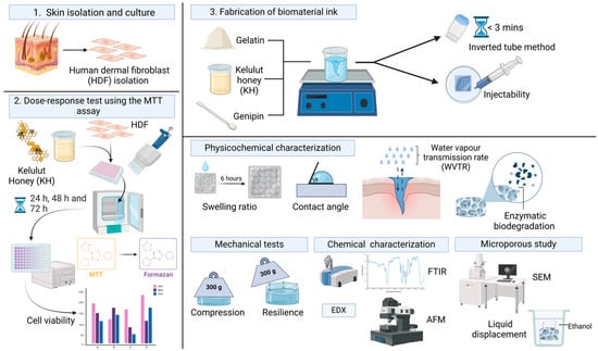 Flow of the study of the injectable gelatin–Kelulut honey hydrogel. Images were created using https://BioRender.com (accessed on 15 January 2025).
