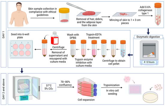 Experimental design for human skin cell isolation. Images were created using https://BioRender.com (accessed on 21 February 2025).