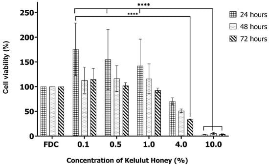 Cytotoxicity of different concentrations of Kelulut honey (0.1%, 0.5%, 1.0%, 4.0%, and 10.0%) toward human dermal fibroblasts measured using the MTT assay. FDC represents the control media used in the MTT assay. **** Indicates p < 0.0001.