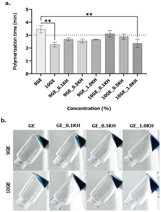 (a). The polymerization times for 9GE and 10GE hydrogels with and without Kelulut honey (** indicates p < 0.01). (b). The inverted jar method to analyze the polymerization time of 9GE and 10GE hydrogels with and without Kelulut honey.