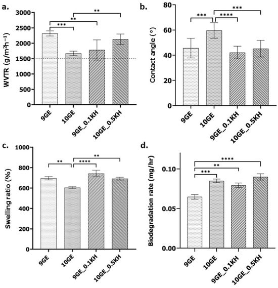Physicochemical analysis of 9GE, 10GE, 9GE_0.1KH and 10GE_10KH. (a) Water vapor transmission rate (WVTR) (g/m2h−1), (b) contact angle (°), (c) percentage of swelling ratio, and (d) biodegradation rate. ** indicates p < 0.01, *** indicates p < 0.001, and **** indicates p < 0.0001.