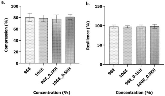 Analysis of the mechanical properties of 9GE, 10GE, 9GE_0.1KH and 10GE_10KH: (a) compression percentage and (b) percentage of resilience.