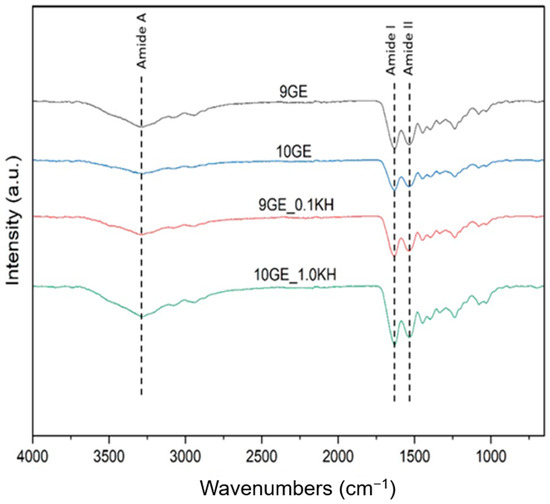 FTIR spectroscopy provides a molecular fingerprint for identifying polymers, crosslinkers, and their chemical bonds. The spectra of the gelatin-based hydrogels reveal characteristic amide and hydroxyl regions, confirming their structural composition (Figure 8).