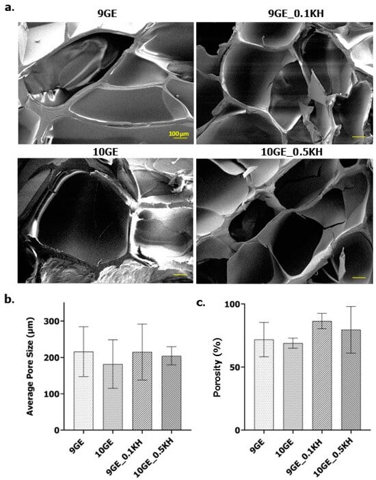 (a) SEM images showing the cross-sectional microporous structure of the hydrogels at 100× magnification; (b) average pore size (μm); and (c) porosity percentage.