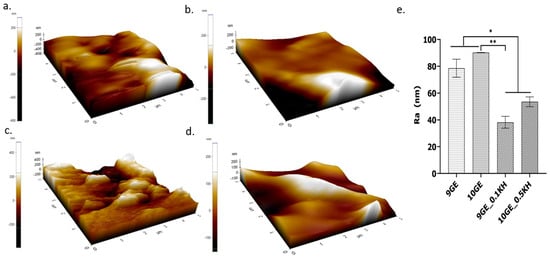Figure 10 shows the surface topology of the hydrogel samples based on AFM scanned images, including the mean surface roughness for all samples. The surface roughness of the hydrogel samples will affect cell adhesion and cell behavior. Overall, Figure 10a,c, which represent gelatin and genipin-crosslinked hydrogels without the addition of Kelulut honey (KH), exhibit a rougher surface topology with distinct peaks, valleys, and significant height variations, indicating a rougher surface. Among them, 10GE has the roughest surface topology and highest mean surface roughness, while 9GE_0.1KH has the smoothest surface topology and mean surface roughness.
