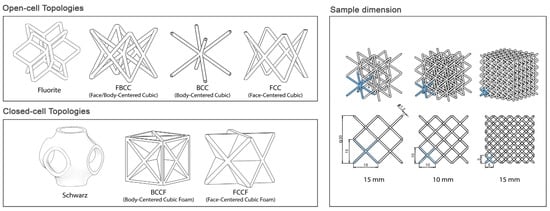 Designing a closed-cell topology typically involves understanding the functional requirements of an open-cell topology. By closing the openings with thin or thick walls, the open-cell structure can be transformed into a closed-cell configuration while preserving the original functional requirements. In this sense, several open-cell and closed-cell topologies have been designed through generative design and architectural material modules in Ntopology® 3.4 engineering design software. AM principles have been followed for a supportless lattice structure design. Key features such as the overhang angle and bridging distance are critical in creating a support-free lattice structure. The overhang angle is the maximum angle at which a part can be 3D printed without support, with 45° being a safe approximation. Bridging distance depends on the melt viscosity of the extruded material and its cooling rate. Both features can be optimized by adjusting variables such as printing speed and printing temperature [48]. Based on these principles, lattice topologies were selected for their suitability in FFF-based supportless lattice printing. Selected geometries are well established in prior research for their mechanical properties and elasticity, making them ideal for applications in lightweight structures while also ensuring practical relevance in real-world 3D printing applications (Figure 1).