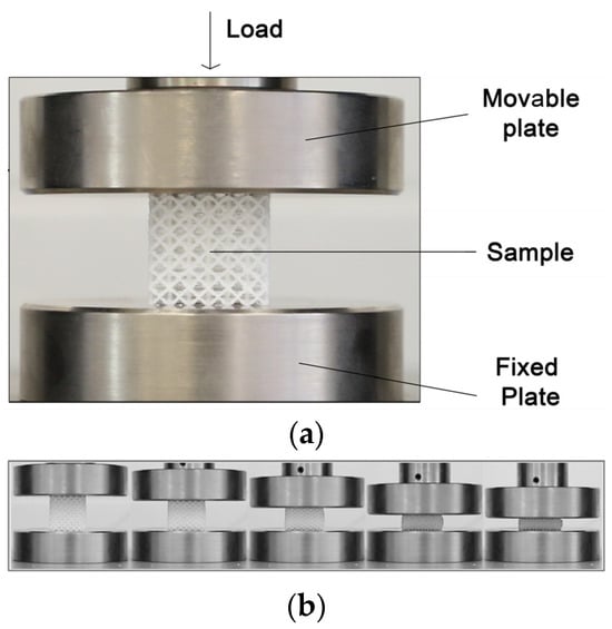 Three units of each sample were manufactured in order to consider the average value between the different samples and tests. In this sense, every lattice sample was tested a total of three times. Each of the samples were referenced using the nomenclature. In Appendix A, Figure A1 shows in detail all manufactured lattice samples. This means that a total of 63 samples were manufactured, with a total of 189 compression tests carried out. Compression tests were conducted using a Shimadzu AG-XPLUS (shimadzu, Kyiv, Ukraine) testing machine equipped with a 50 kN load cell capable of performing various static tests, including compression, tension, and bending. The testing machine was managed using Trapezium X software (Simadzu, Kyiv, Ukraine), through which all the variables associated with the sample and those test parameters, such as speed or compression distance, were established. The lattice samples were compressed between the two steel plates of a machine (Figure 2). The lower platen was fixed, while the upper platen moved with constant set speed. The compression speed of the test was set to 1 mm/s, and the total travel distance of the upper plate was set to 20 mm. Consequently, the samples were compressed up to approximately 70% (2/3) of their initial size. This represents a critical deformation threshold where structural collapse or plastic deformation occurs. This value is commonly used to assess energy absorption capacity before total failure, simulating real-world conditions. It also allows for the evaluation of elastic recovery, material densification, and the transition between elastic and plastic behavior in cellular structures. To ensure accurate stress evaluation, individual cross-sectional area measurements were performed for each lattice structure type prior to the commencement of compression testing. This approach addressed the dimensional variability inherent in the diverse lattice structure geometries. By conducting specimen-specific measurements, the assumption of a uniform area was avoided, enabling a more precise stress calculation during data analysis.