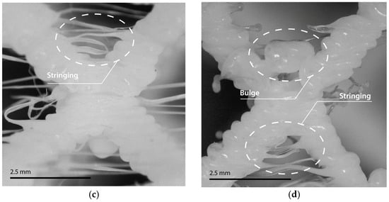 It is possible to observe that the mentioned defects occur regardless of the unit cell size or cell topology [50]. However, it was found that quality deficiency was found to be more predominant in open-cell lattice samples in comparison with closed-cell lattice samples. Specifically, the aforementioned quality deficiency was found to be more noticeable in open-cell lattice samples with larger unit cell sizes compared to smaller unit cell sizes where print quality was significantly improved. This phenomenon could be due to the fact that the TPU-based lattice samples can easily deform in contact with the movement of the extruder itself, which would cause buckling and bending issues during the printing [51,52]. In this sense, it was observed that the appearance of the stringing effect and material bulges was more prominent in open-cell lattice samples regardless of the unit cell size. This could be directly related to the increase in the possibility of extruder material dripping when traveling a greater distance without depositing material [53].