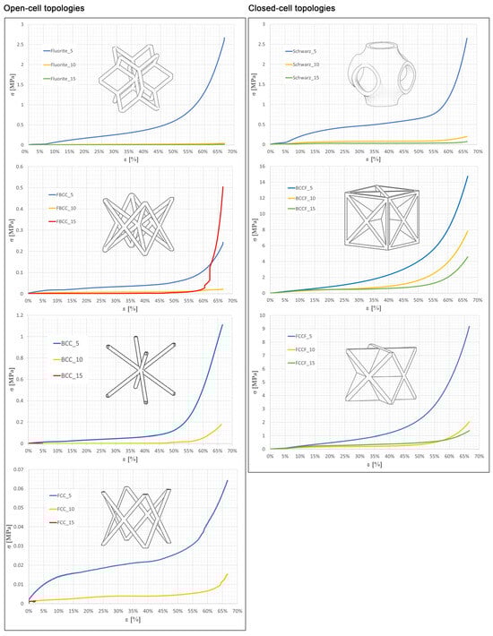 Overall, an elastic response was obtained up to approximately 5% deformation. In the same way, plateau stress increased progressively until reaching a deformation of around 50–60% prior to densification. Several effects of sample deformation due to the lattice core were observed. The stress values for each stress–strain curve region were found to be directly related to unit cell sizes and topologies. In general terms, samples with larger unit cell sizes presented higher deformation values compared to samples with smaller unit cell sizes. It was found that the densification period began earlier for samples with smaller unit cell sizes, with approximately 60% deformation for larger unit cell sizes and 50% for smaller unit cell sizes.