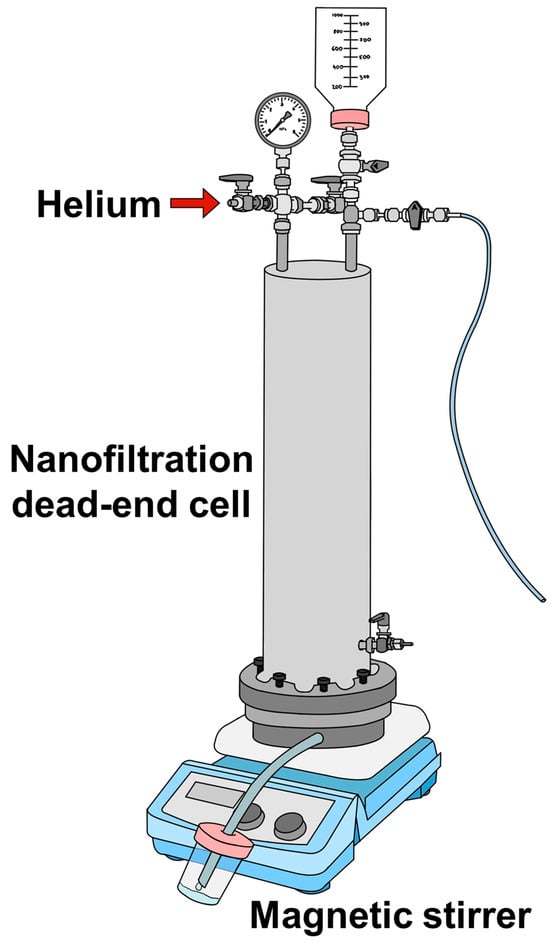 The transport characteristics of the substrate and thin film membranes were investigated by nanofiltration for the separation of dyes. A dead-end laboratory cell (NPK BIOTEST, Kirishi, Russia) with an effective membrane area of 0.2 × 10−2 m2 was utilized at room temperature and a transmembrane pressure of 1 bar. A schematic diagram of the setup with the nanofiltration cell is presented in Figure 1.