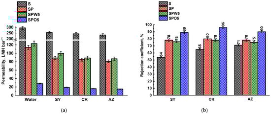 The membrane permeability (L, L m−2h−1bar−1, LMH bar−1), as the ratio of permeation flux (J) to the transmembrane pressure (∆P, bar) (Equation (1)), and rejection coefficients (R, %) (Equation (2)) were calculated as follows []: