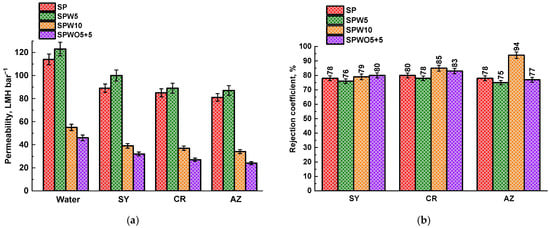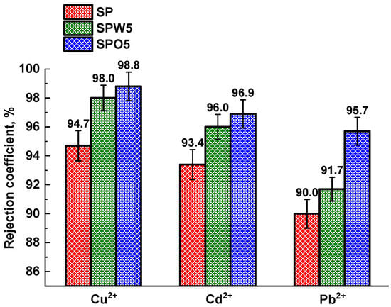 The SP, SPW5, and SPO5 membranes were further evaluated for nanofiltration performance using aqueous solutions containing heavy metal ions to assess their potential for industrial wastewater treatment applications (Figure 4). Throughout these experiments, the membranes maintained permeability values consistent with the water permeability data shown in Figure 2.