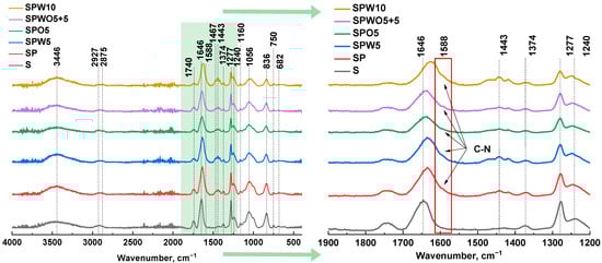FTIR spectra of the S and TFC (SP, SPO, SPW, and SPWO) membranes.