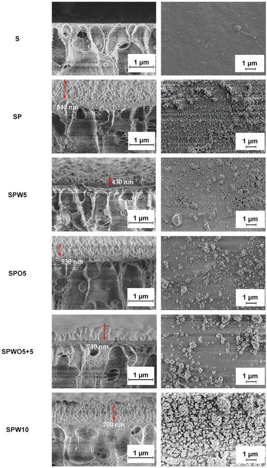 The morphology of the S substrate and TFC membranes was investigated by SEM. Figure 6 presents microphotographs of the cross-section and surface of the membranes.