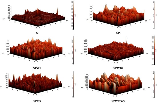 The surface topography was also investigated by AFM. Based on the AFM images presented in Figure 7, the average surface roughness (Ra) of the substrate and membranes was calculated. The Ra and contact angle values are summarized in Table 3.