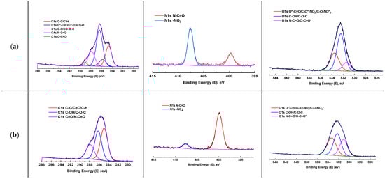 Based on the FTIR spectra, characteristic peaks of CA were identified, reflecting the stretching vibrations of the ester group C=O and C-H from CH3 at 1740 cm−1 and 2927 cm−1, respectively. The peaks at 1374 cm−1 and 1240 cm−1 represent the deformation vibrations of the -CH3 group, while the peak at 1056 cm−1 is attributed to ether functional groups C-O-C []. For CN, the peaks at 1646 cm−1 and 1277 cm−1 indicate the asymmetric and symmetric stretching vibrations of the nitro groups NO2, whereas the peaks at 836 cm−1, 750 cm−1, and 682 cm−1 correspond to the stretching vibrations ν(N-O), bending vibrations γw(NO2), and scissoring vibrations δ(NO2), respectively []. Additionally, the peaks at 3446 cm−1 and 1467 cm−1 reflect stretching and deformation vibrations of the O-H group. The peak at 2875 cm−1 is associated with the stretching vibrations of C-H (CH2) for both CA and CN [,].