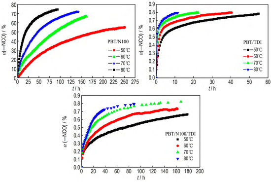 The α-t curves of -NCO in PBT/N-100, PBT/TDI, and PBT/N-100/TDI systems at different temperatures [39].