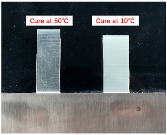 In recent studies on PBT binders, Zhao et al. [41] systematically investigated the effects of curing conditions and crosslinking parameters on material properties. By fixing the isocyanate-to-hydroxyl molar ratio (R-value) at 1.0, they observed that PBT elastomers cured at 10 °C exhibited significantly lower optical transparency than those cured at 50 °C (Figure 7), which was attributed to the retained microcrystalline domains formed under low-temperature curing. Furthermore, variations in the R-value (0.8–1.3) were found to critically influence network architecture and mechanical behavior. Increasing R-values led to enhanced crosslinking density, which improved tensile strength at both 20 °C and 60 °C but reduced elongation at break due to restricted chain mobility. Notably, the glass transition temperature (Tg) of the elastomers decreased progressively with higher R-values, suggesting a trade-off between mechanical reinforcement and segmental flexibility. These findings highlight the tunability of PBT-based binders for propellant applications, where balanced strength and elasticity are essential to withstand extreme operational conditions while maintaining processability. This systematic investigation emphasizes the importance of optimizing curing parameters and stoichiometry to tailor PBT elastomers for advanced solid propulsion systems.