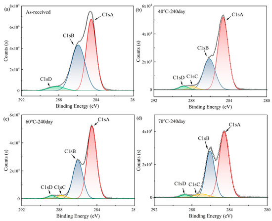 C1s spectra of PBT elastomer at different aging times [43]: (a) original sample; (b) age at 40 °C for 240 days; (c) age at 60 °C for 240 days; (d) age at 70 °C for 240 days.