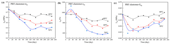 Change in mechanical properties vs. time: (a) σm; (b) εm; (c) Ehy [44].