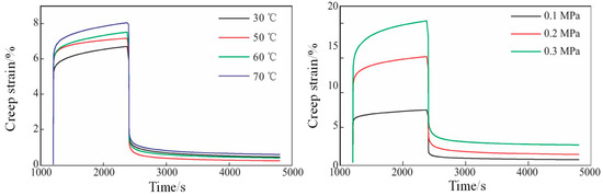 Creep mechanical properties of PBT propellants at different test temperatures (left) and under different loading stresses (right) [53].