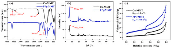 As shown in Figure 2a, in the Ca-MMT spectrum, the peaks at 3578 cm−1 and 3388 cm−1 correspond to the stretching vibrations of montmorillonite-OH. Since these vibrations are prone to association, both free and associated hydroxyl groups exist, which results in two peaks in this region. The peak at 1617 cm−1 is attributed to the stretching vibration of interlayer water molecules in montmorillonite, indicating the presence of a small amount of free adsorbed water. In the PPy/MMT spectrum, the peak at 3568 cm−1 is caused by the combined stretching vibrations of N-H and -OH, and the peak at 1617 cm−1 is weakened, which can be attributed to the evaporation of interlayer water molecules during the preparation of PPy/MMT. At the same time, peaks at 1510 cm−1, 1396 cm−1, 1277 cm−1, and 1136 cm−1 correspond to the C-C stretching vibration, C-N stretching vibration, C-N in-plane bending vibration, and pyrrole ring breathing vibration of polypyrrole, respectively. It can be observed from the PPy/MMT spectrum that both the characteristic peaks of MMT and PPy are present in the infrared spectrum of PPy/MMT, indicating that pyrrole successfully polymerized between the montmorillonite layers [24].