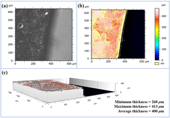 As shown in Figure 3a,b, the orange–yellow region represents a thickness of approximately 350 μm, while the yellow region corresponds to a thickness of 260–280 μm. Additionally, it can be observed that the surface of the composite membrane is uneven, which is caused by the rough surface of the PPy/MMT, and this rough surface contributes to the wettability of the PPy/MMT/PP toward water. As shown in Figure 3c, after simulation calculations, the maximum height of the PPy/MMT is 413 μm, the minimum height is 260 μm, and the average thickness is 400 μm.