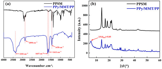 FTIR patterns (a), X-ray diffraction spectrogram (b) of PPSM and PPy/MMT/PP.