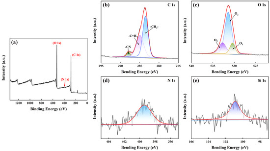X-ray photoelectron spectroscopy of PPy/MMT/PP: Full-range XPS spectrum (a) and high resolution XPS spectra of C 1s (b), O 1s (c), N 1s (d), Si 1s (e).